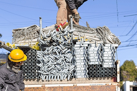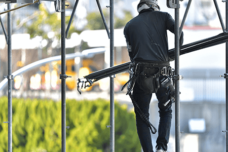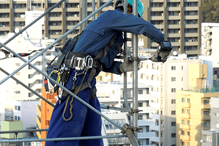 ビルや橋梁、倉庫や発電所など、様々な構造物の建設に必要となる、足場・安全設備を設置します。外壁の塗装や補修のための工事にも必要となります。当然足場の解体も含まれます。